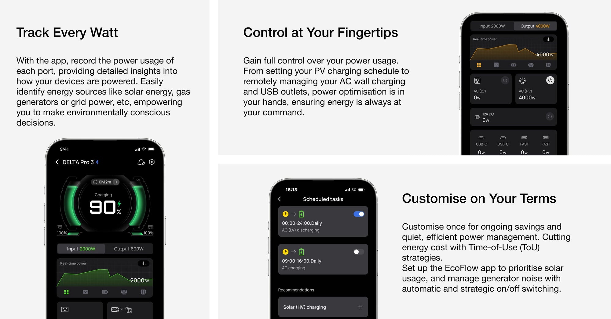 • Store Solar, Slash Bills: With up to 2600W solar input, store excess by day and power your EV overnight—save up to £1,314/year.*