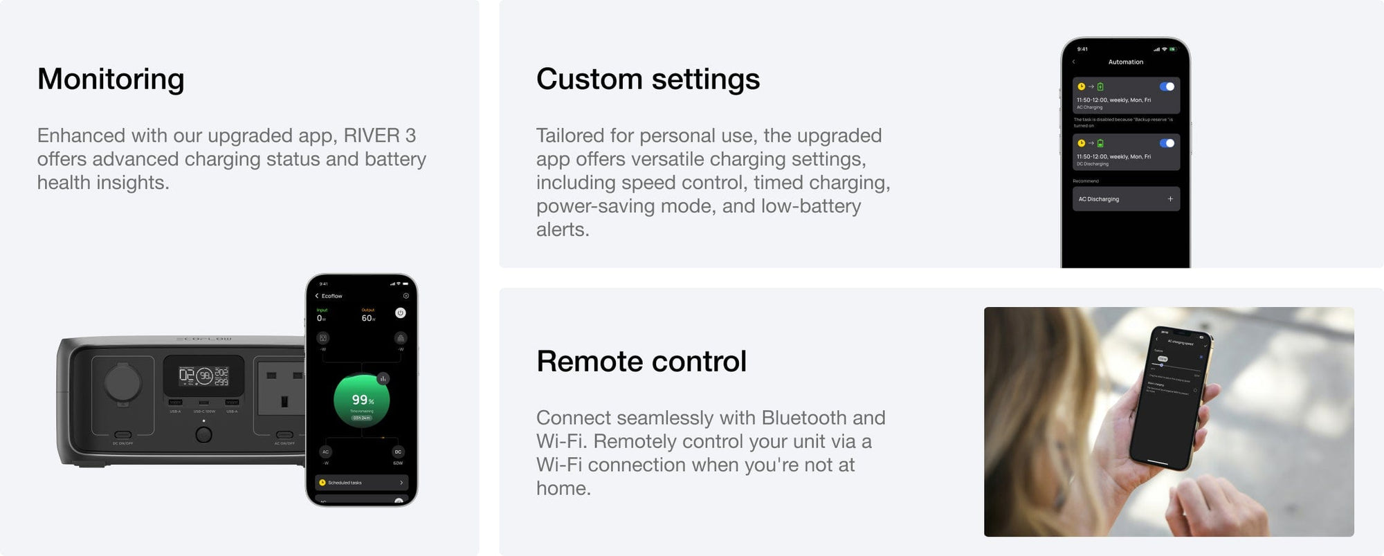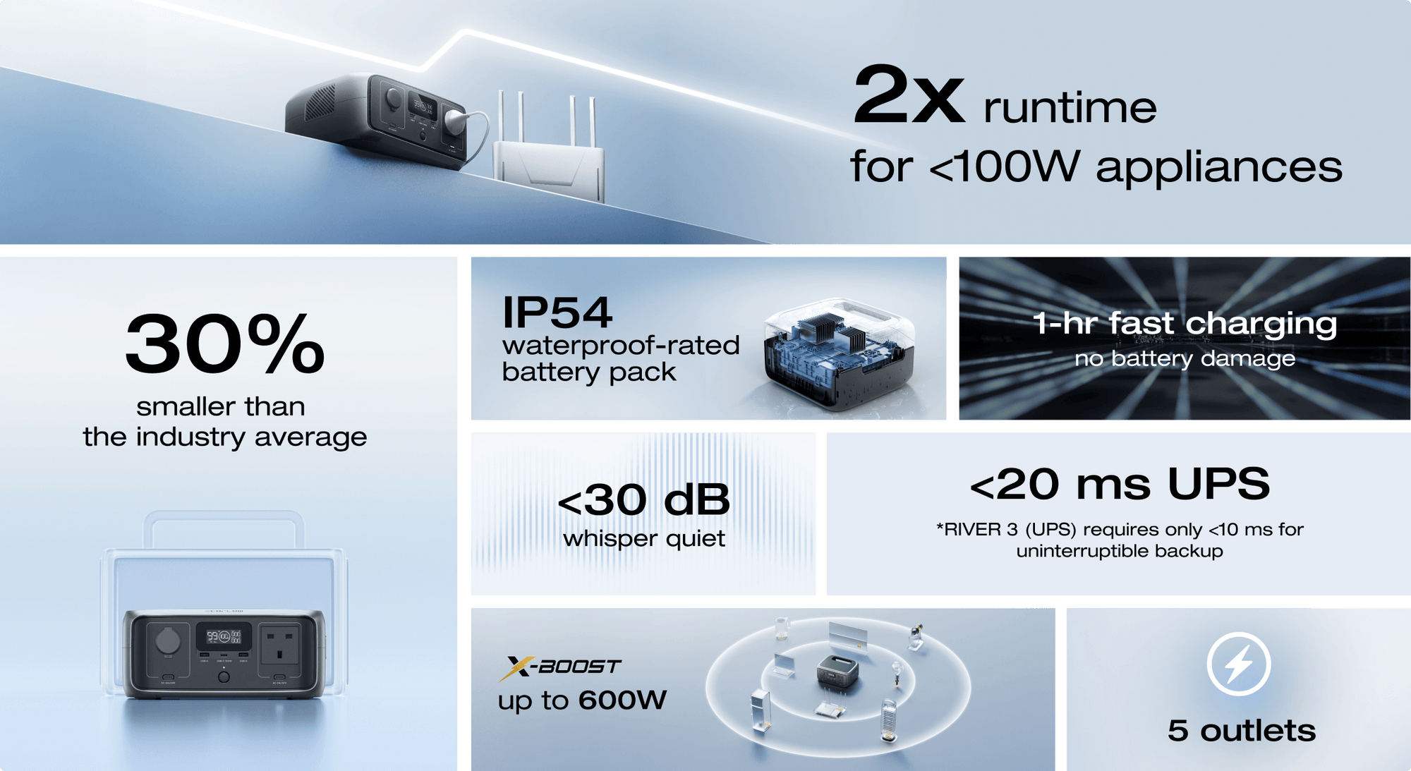 RIVER 3 revolutionises energy efficiency, delivering double runtime for appliances under 100W, extending use at home and in the great outdoors.¹