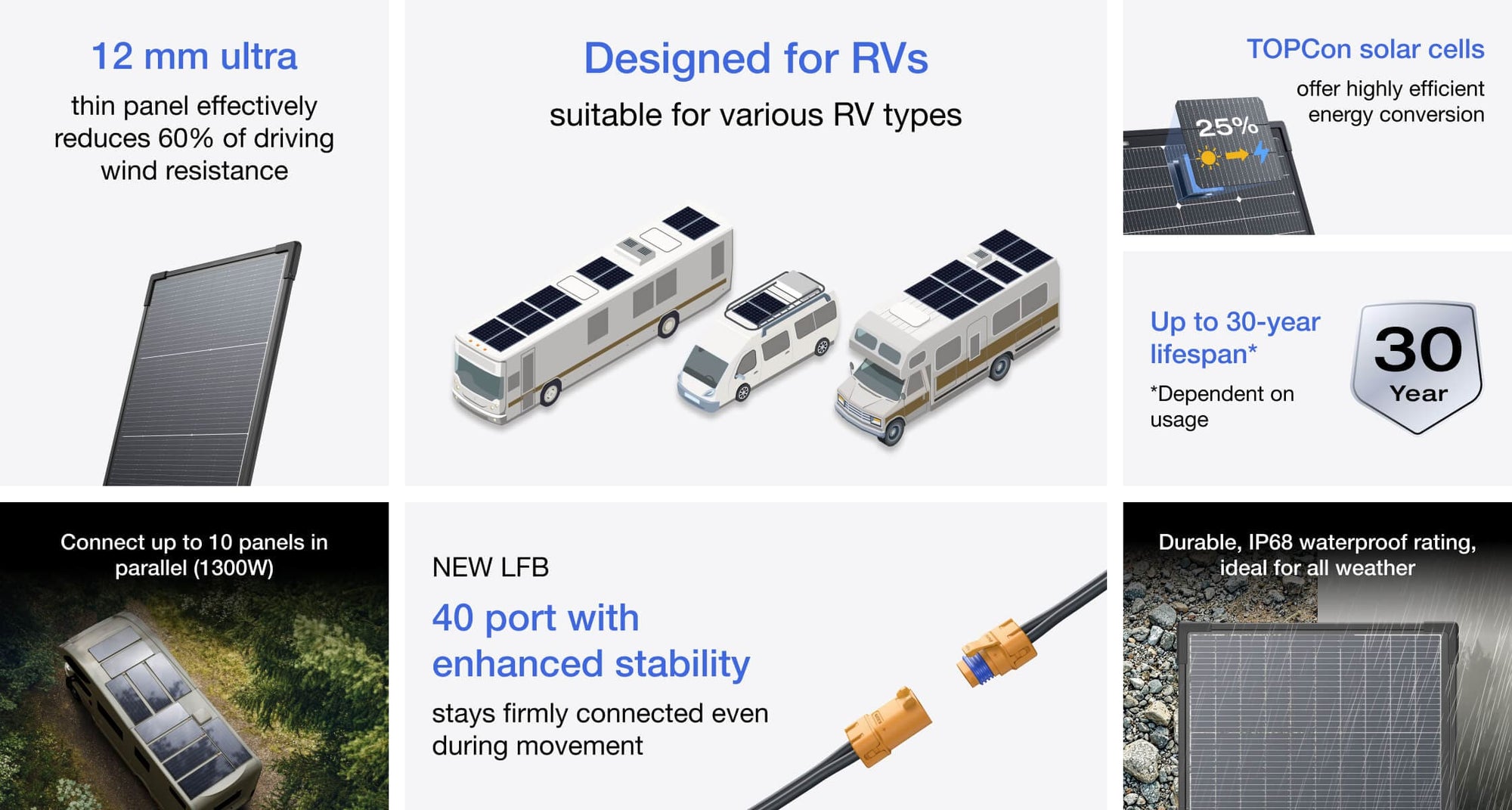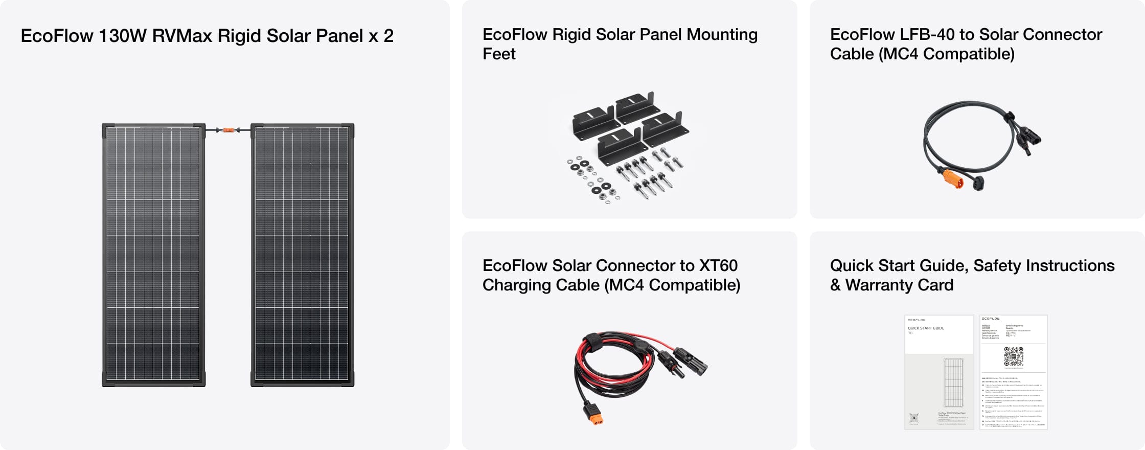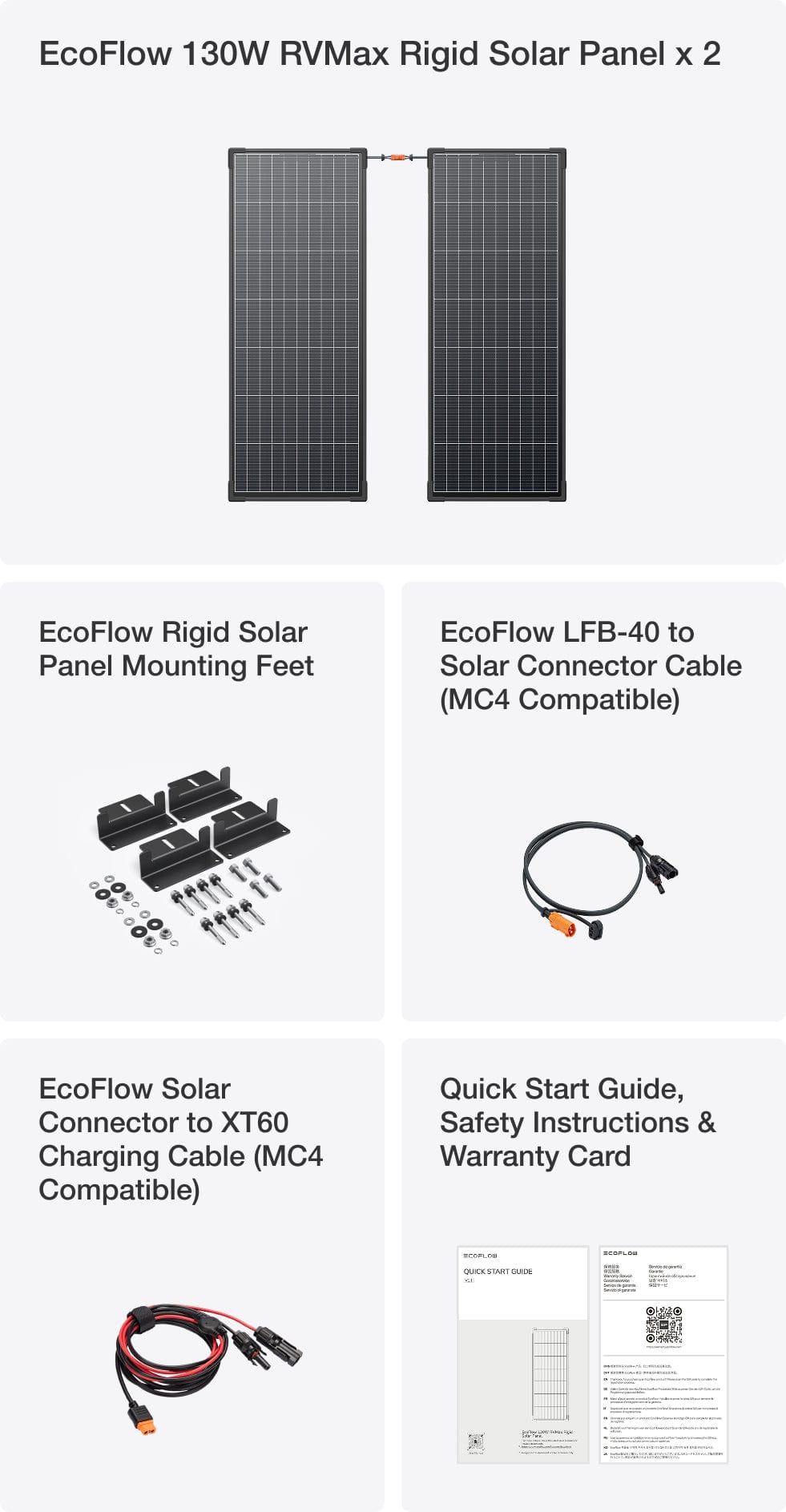 EcoFlow 130W RVMax Rigid Solar Panel features an innovative modular design, delivering up to 130W power, 50V, and 3A current output, and connects up to 10 panels within a safe range. Works seamlessly with various power stations.