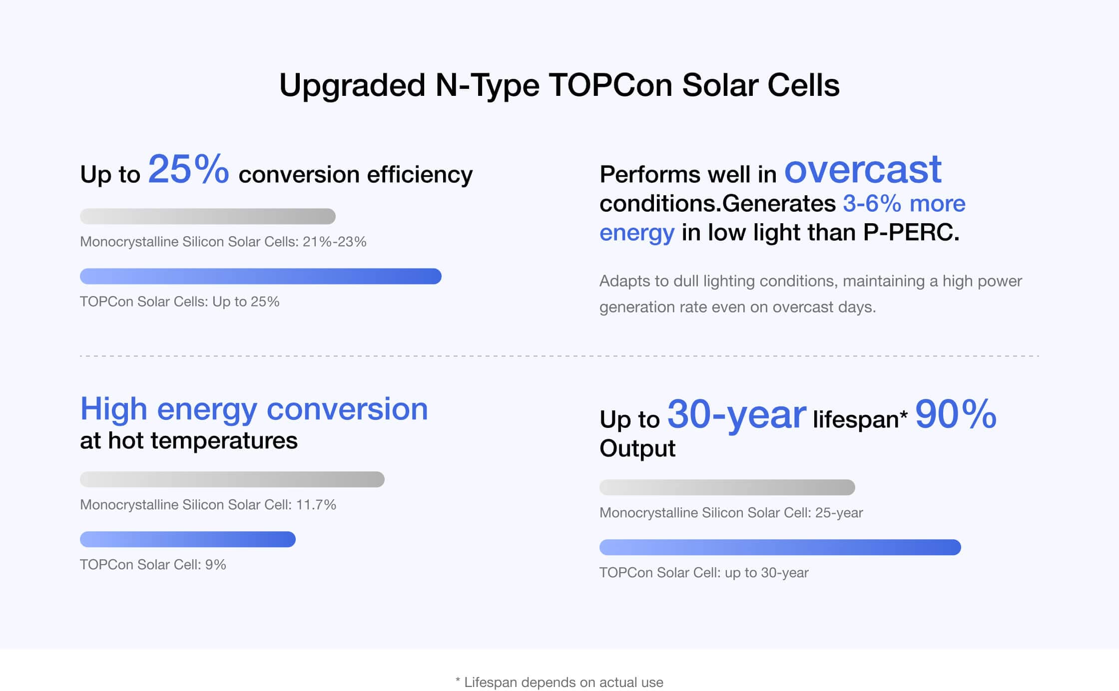 With N-Type TOPCon technology, achieve up to 25% conversion efficiency.