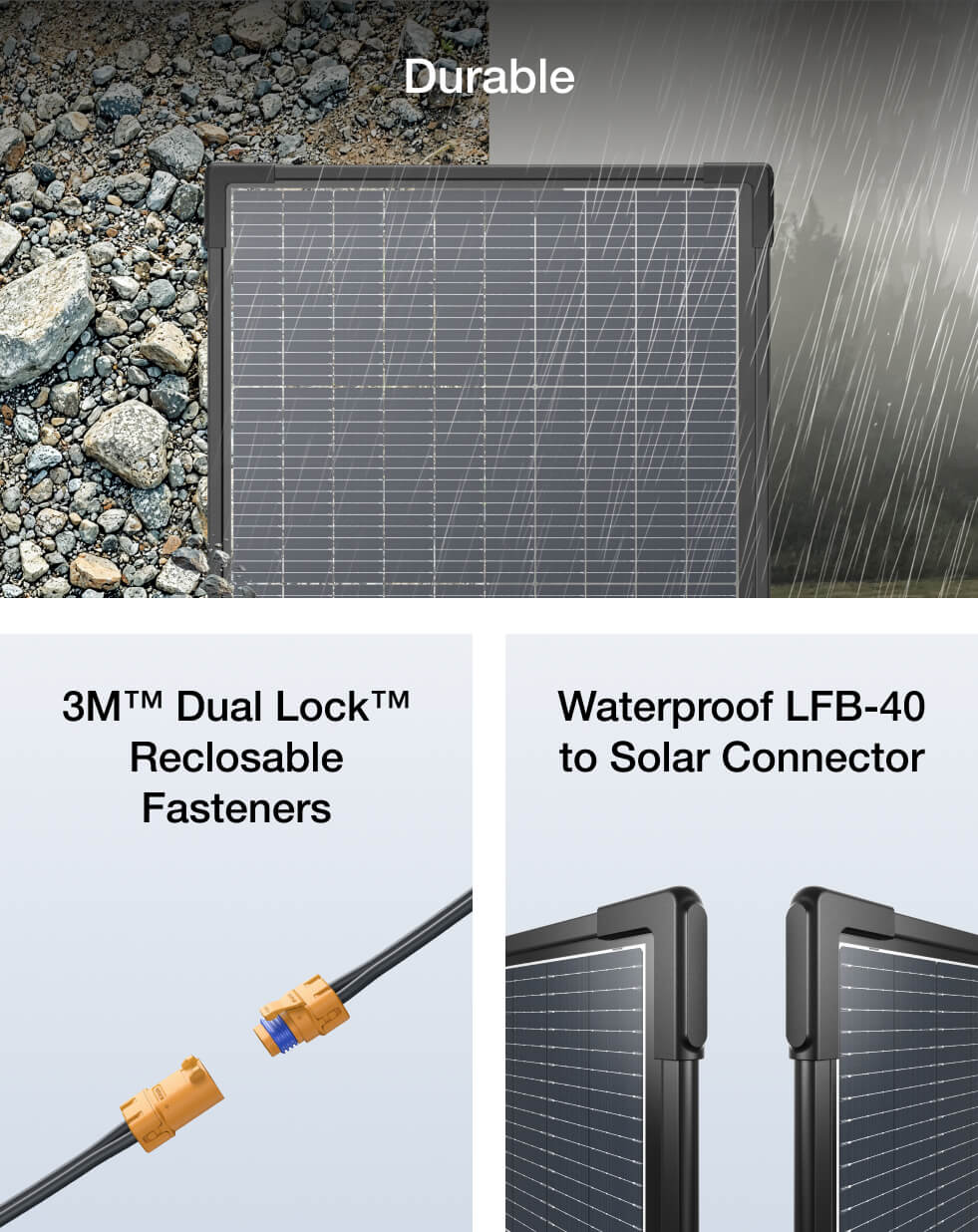 Easily connect to third-party solar systems using the includedphotovoltaic connector (MC4 compatible)⁴. Safely charge yourpower systems and portable power stations with XT60 connectors, featuring waterproof, anti-leak technology that's touch-safe and reliable.
