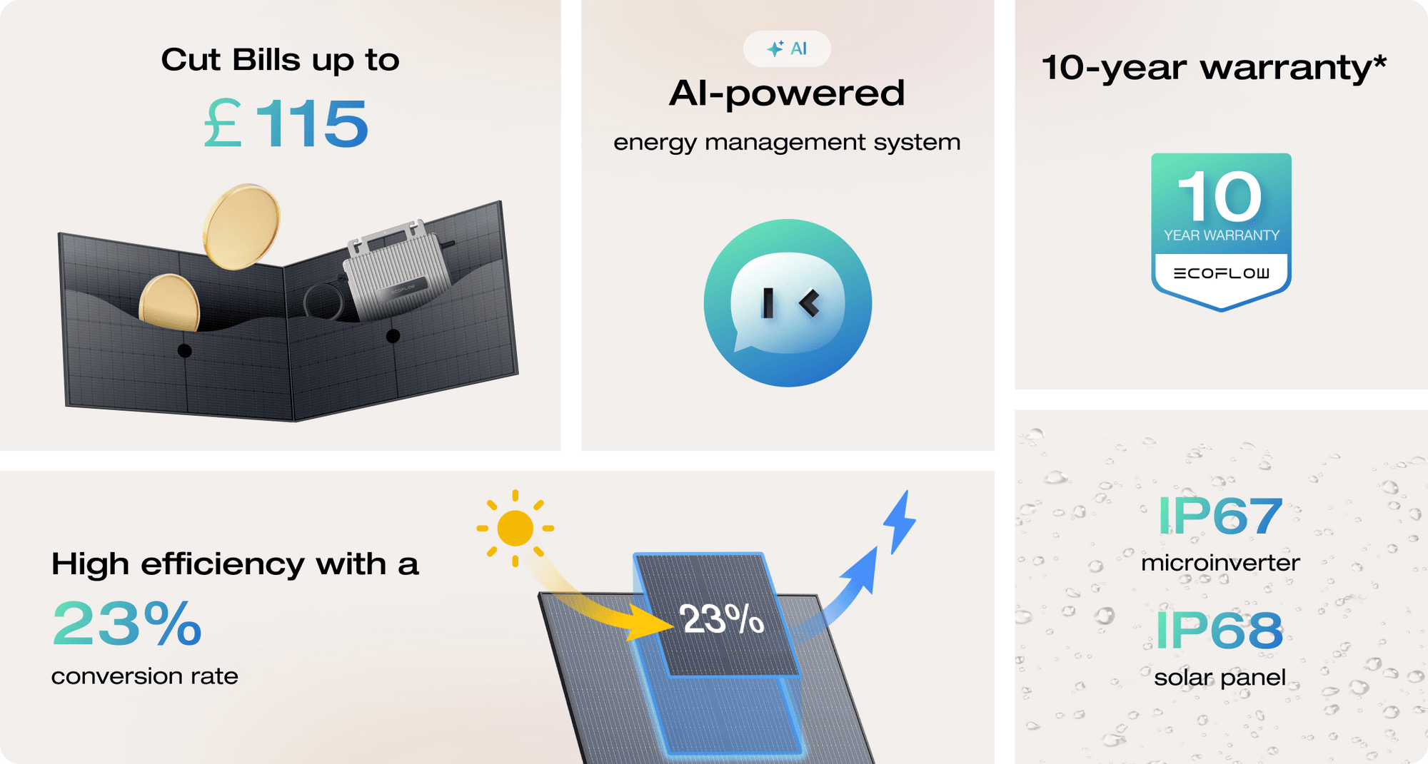 The EcoFlow STREAM Solar System seamlessly integrates solar panels with a microinverter, converting sunlight into ready-to-use electricity for your home.It can power your Wi-Fi router, refrigerator, TV, and radio during the day. Capable of generating up to 858 kWh annually, this system can help you save up to £115 per year on energy costs.