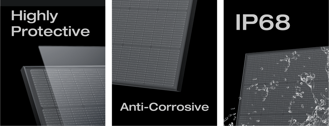 Built with a robust anti-corrosive aluminum frame, it's designed for years of solar-ray collection. Its TOPcon cells are coated with highly protective lamination and tempered glass and comes with an IP68 waterproof rating to enhance performance and offer long-lasting durability.