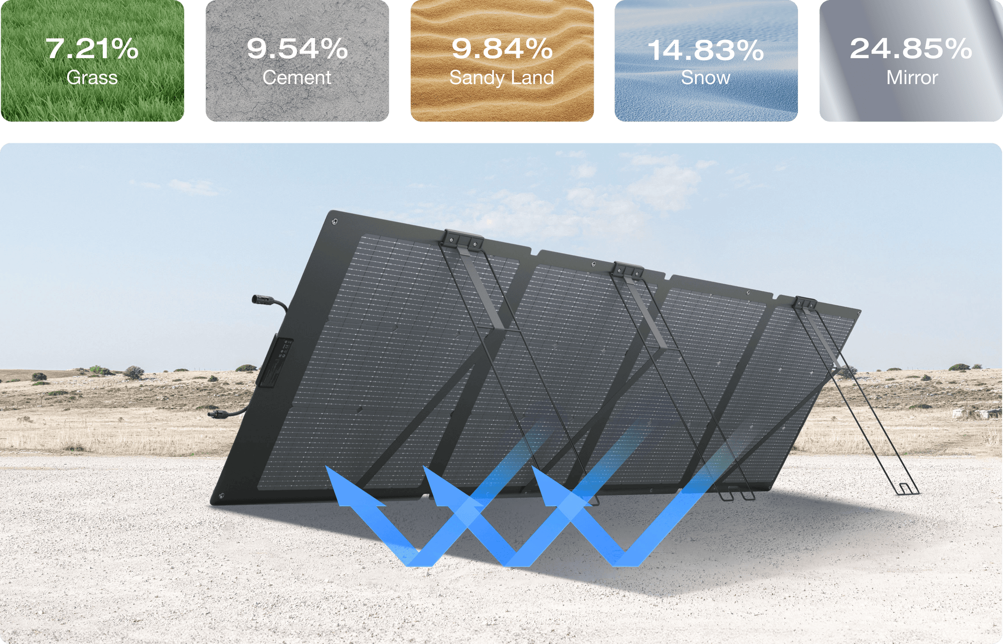 With a 220W primary side, and a 175W side on the back for ambient light, you can capture up to 28% more solar energy and charge your portable power station even faster.