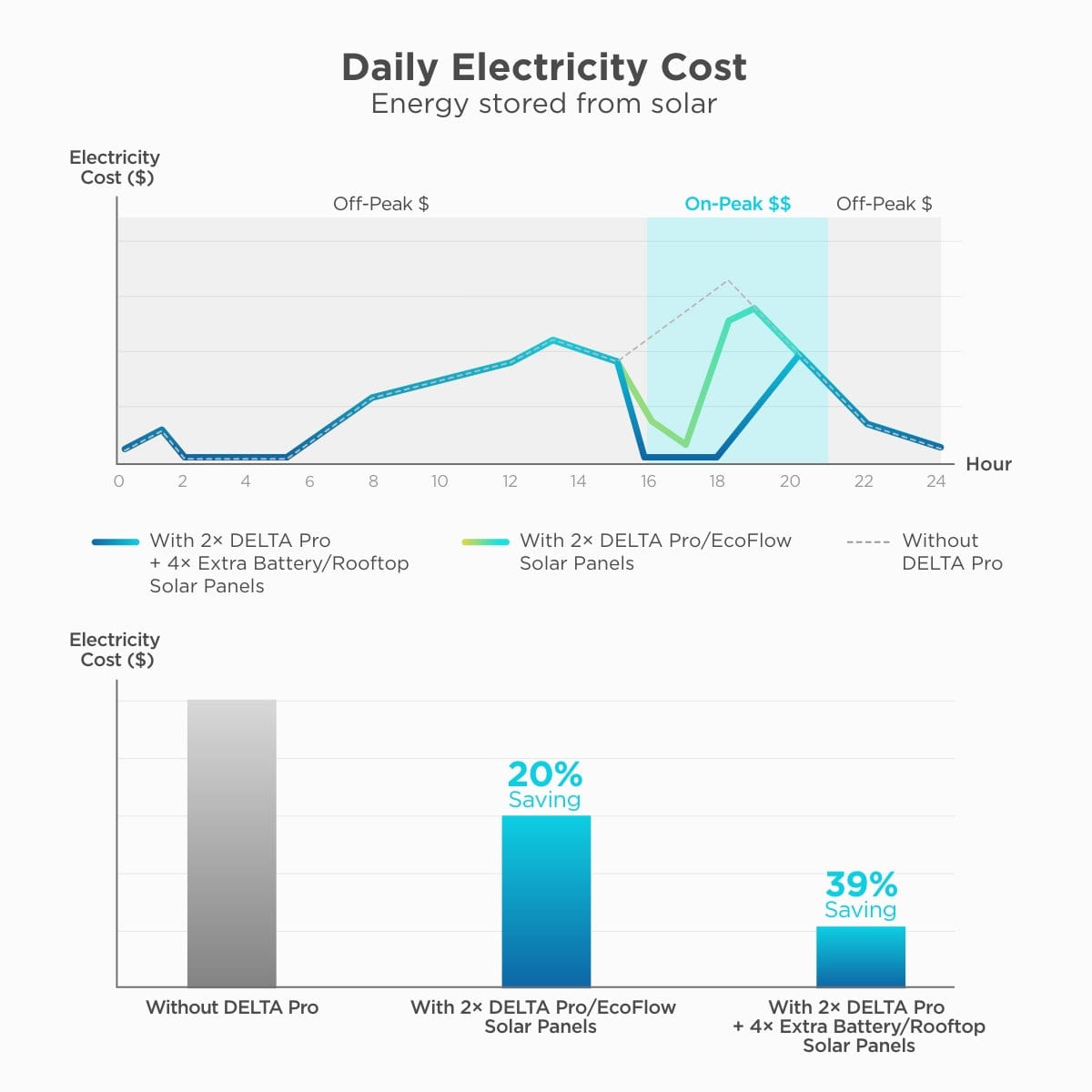 Draw power from your DELTA Pro(s) to power your home during peak energy use hours, this lowers your bills and reduces pressure on the grid during peak hours. During off-peak hours, use low-cost/renewable energy to charge your DELTA Pro(s) back to full.