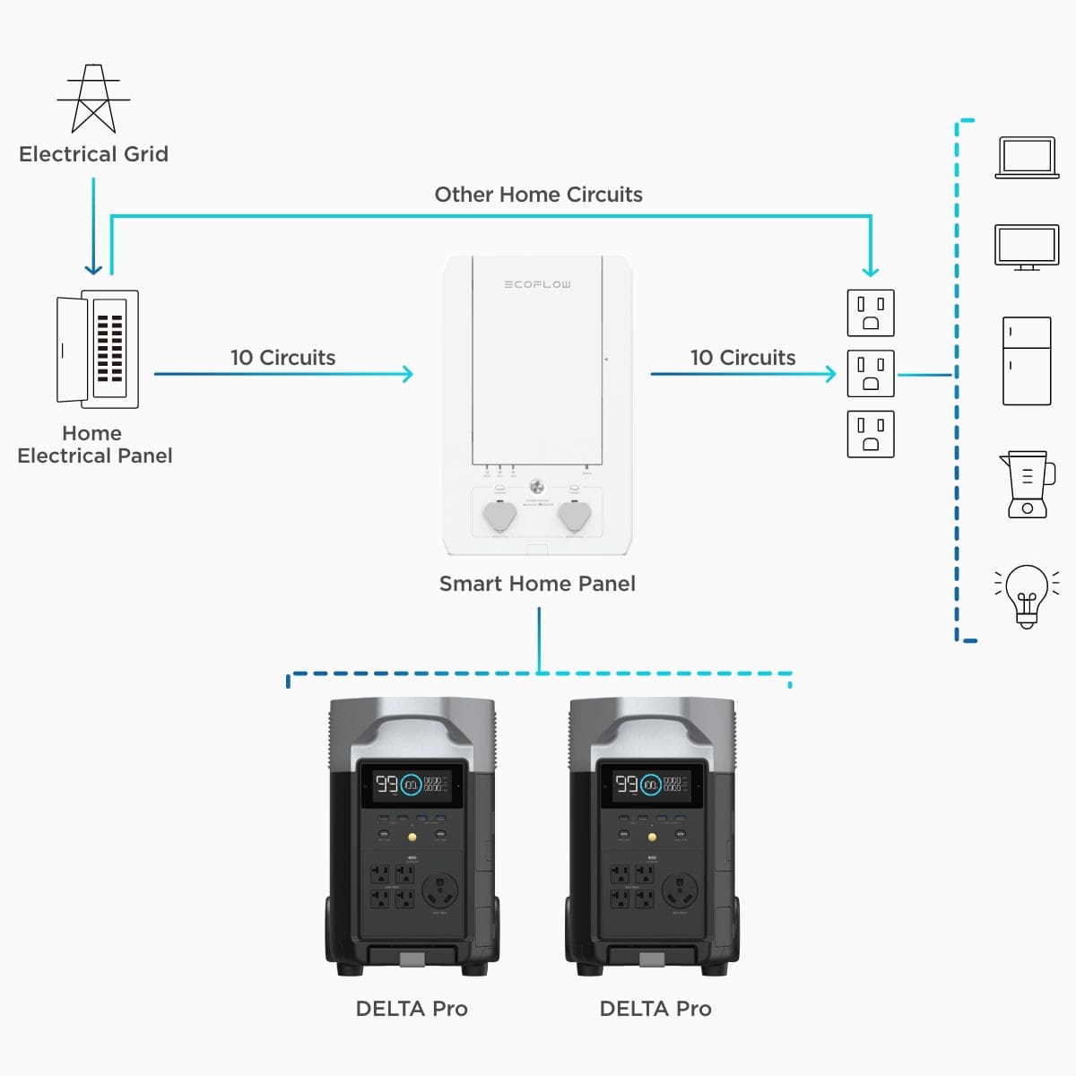 When a blackout hits, the Smart Home Panel immediately switches to your 10 integrated circuits and draws power from your DELTA Pro(s). You'll barely notice a loss of power as your chosen circuits stay powered with a mere 20ms switchover time.