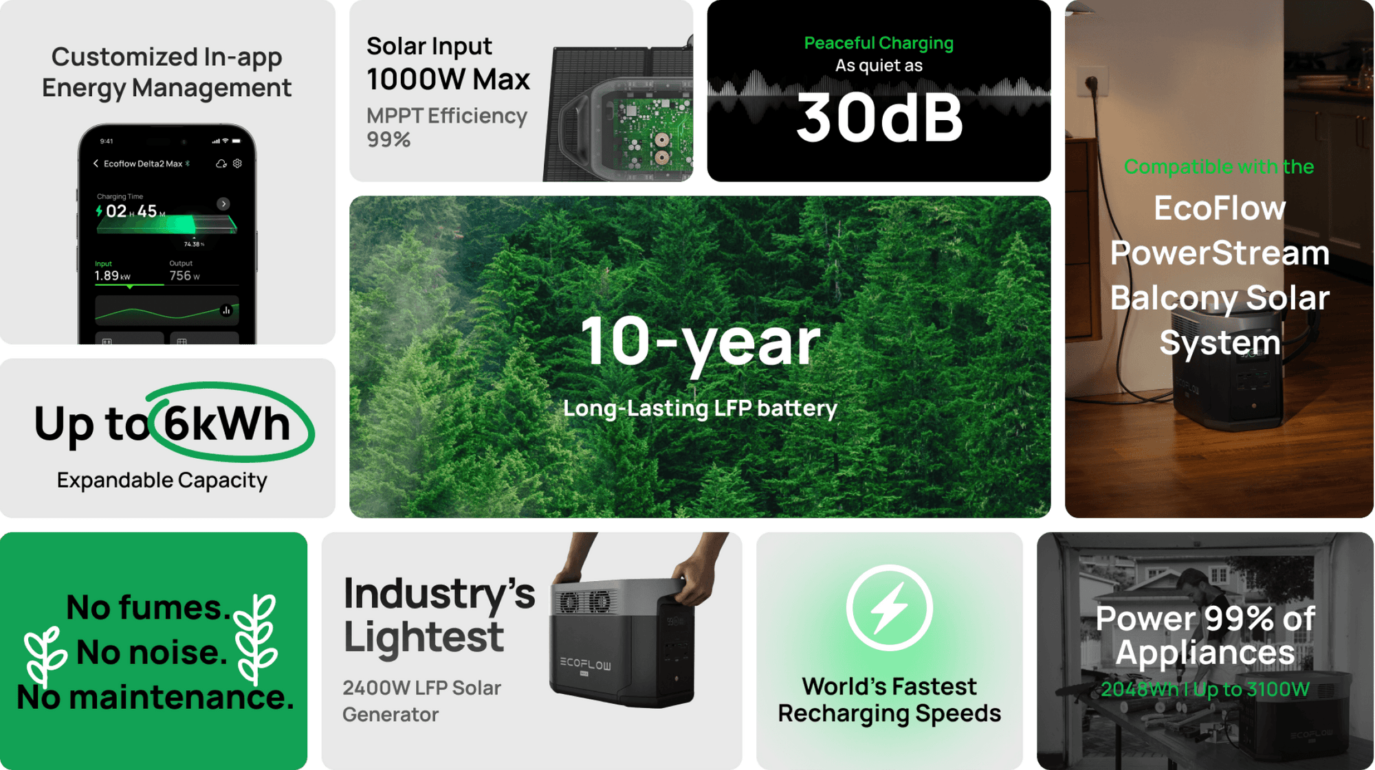 Industry's Lightest 2400W LFP Solar Generator. Even with its upgraded LFP battery, DELTA 2 Max is still 30% lighter than similar power stations on the market.