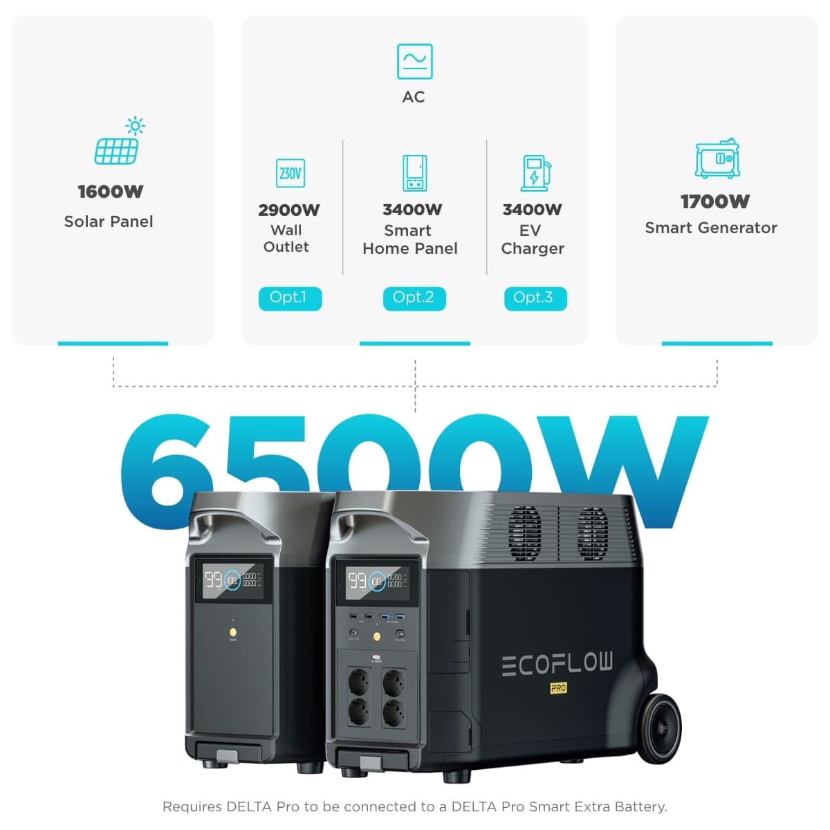 Support up to two DELTA Pro Smart Extra Battery/Smart Generator