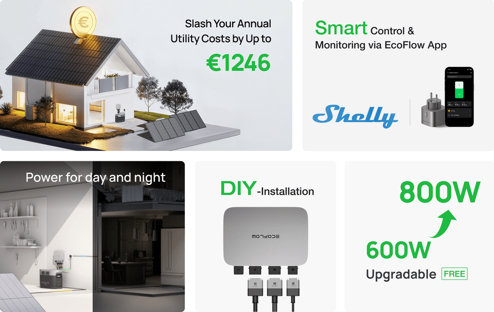 EcoFlow PowerStream Solar System is a balcony solar system with a portable power station that allows you to use solar energy day and night and reduce energy bills. EcoFlow Smart Plug and EcoFlow app enable real-time energy usage monitoring and optimization.