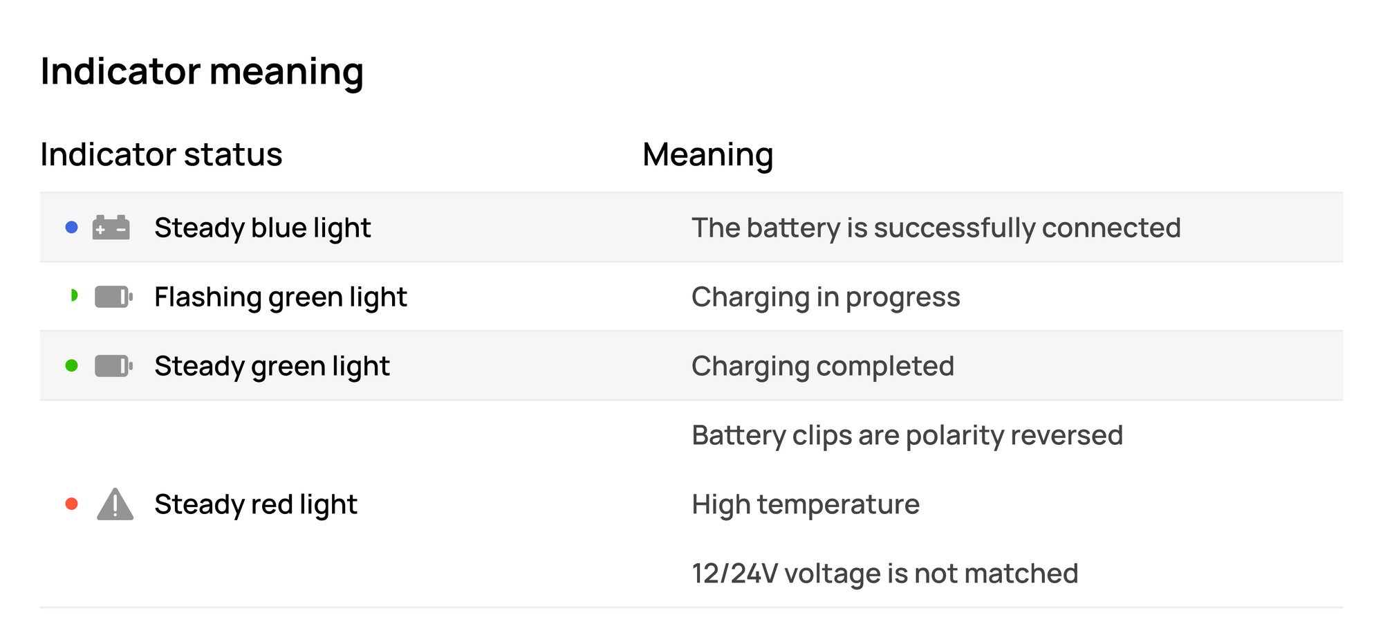 A safety feature will halt charging if the battery clips are connected in reverse. A red warning light will glow, ensuring your battery remains safeguarded.