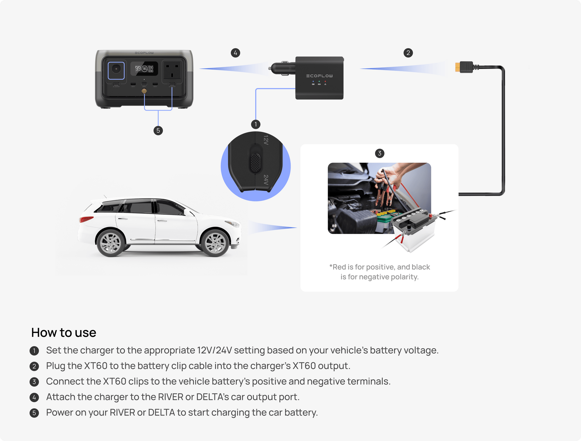 Take the EcoFlow Smart Auto Battery Charger along for the ride with your RIVER or DELTA Series portable power stations to stay charged up on any road trip.