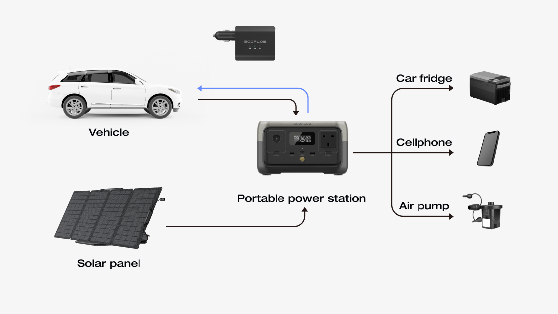 Recharge your car battery when it's low, or charge RIVER or DELTA via your 12V car socket to access multiple outlets like AC, USB-C, USB-A, and DC5521 ports.* Add solar panels to capture unlimited solar energy, so you'll never need to worry about power shortages on the go.