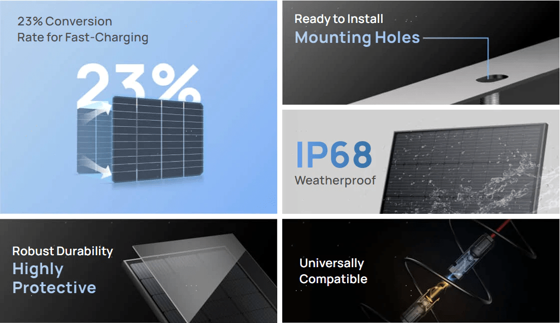 Our 100W rigid solar panel has an excellent conversion rating of 23%, allowing you to charge even faster. Combine as part of your Power Kits setup or EcoFlow portable power station, and the integrated MPPT algorithm optimizes your solar input.