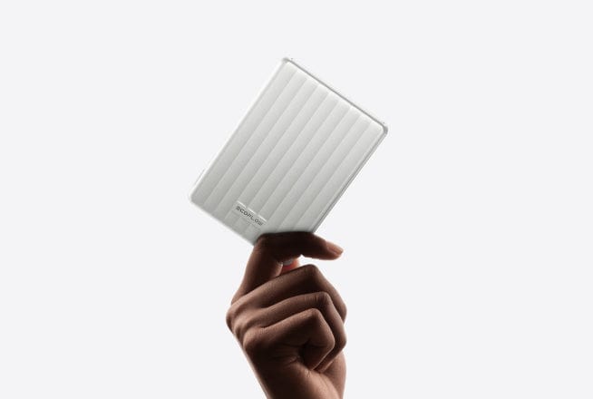 Around the same thickness as a stack of five 20-pence coins. A lithium cobalt battery packs 5,000mAh into a slimline design. Slides invisibly into pants pockets, a slim laptop bag, or a purse.