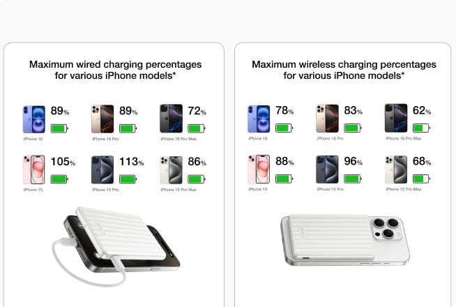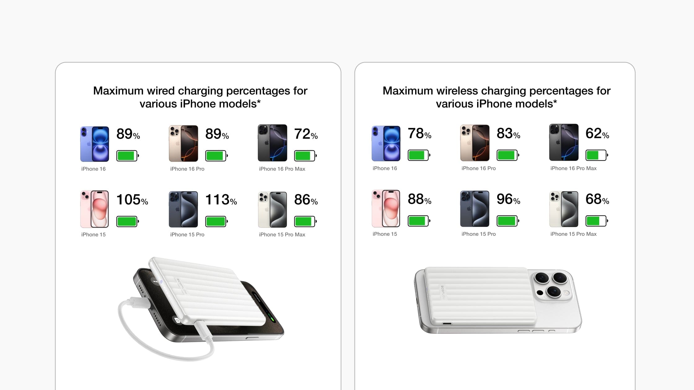 * Based on internal laboratory testing. A fully charged 5,000mAh power bank provides approximately 3000mAh to 3100mAh of usable power due to 35% to 40% energy loss.
