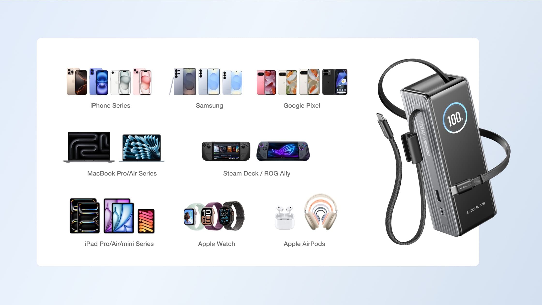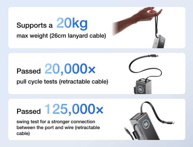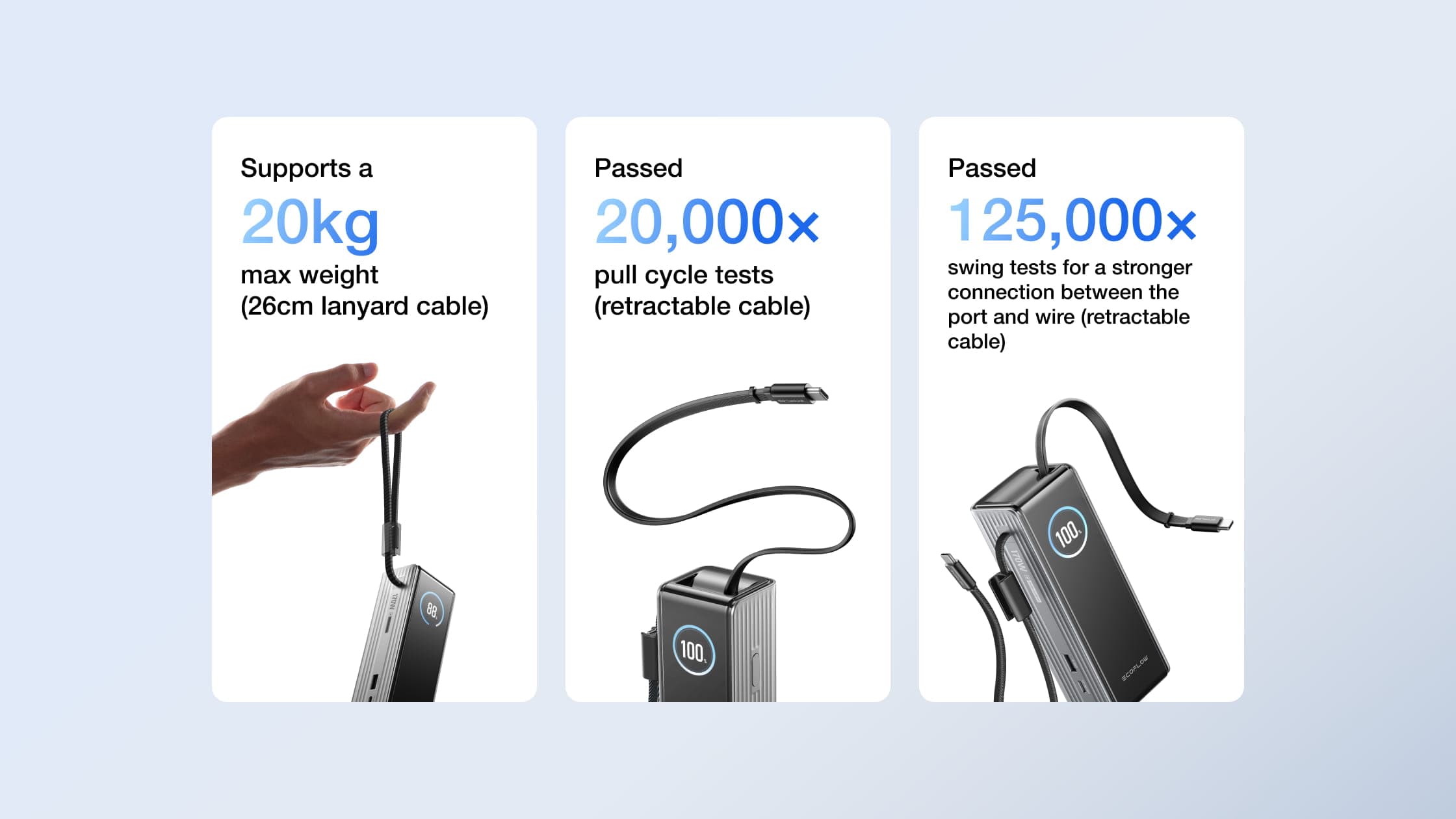 No more lost cables—the 100W built-in USB-C retractable and lanyard cables are always there, tucked neatly into the power bank's sleek design, with a retractable mechanism that lets you access power in seconds.