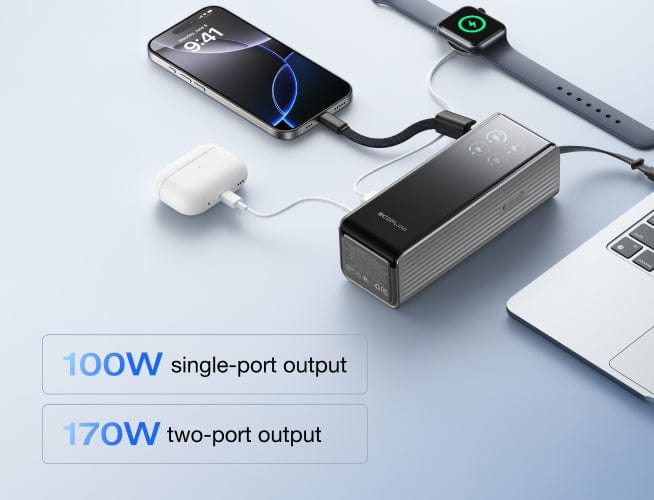 • 170W Fast Charge: Simultaneous multi-port output up to 170W, supports charging up to four devices at the same time. 100W max for single-port charging.