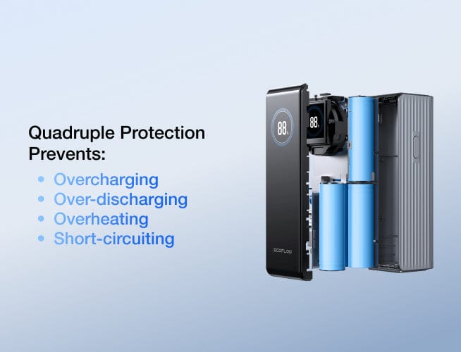 Features pro-grade battery technology found in electric car batteries. EcoFlow RAPID's Battery Management System continuously monitors the charging process with quadruple protection to prevent overcharging, over-discharging, overheating, and short circuiting, ensuring safe and stable operation.