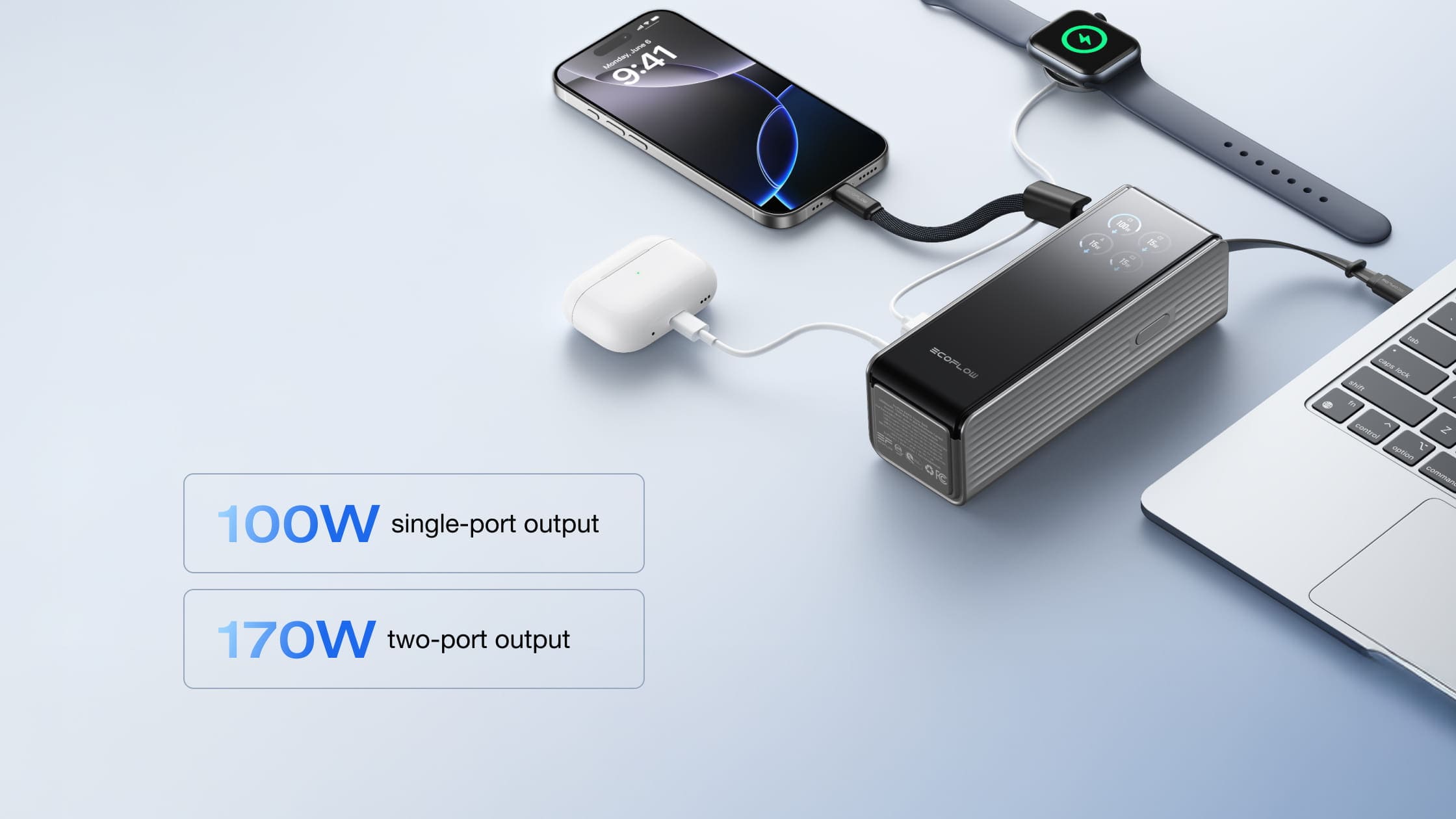 When devices need power, it gets a maximum 100W boost through the USB-C port. With smart distribution, it can deliver power across your laptop, phone, tablet, and earbuds—four devices all at the same time.