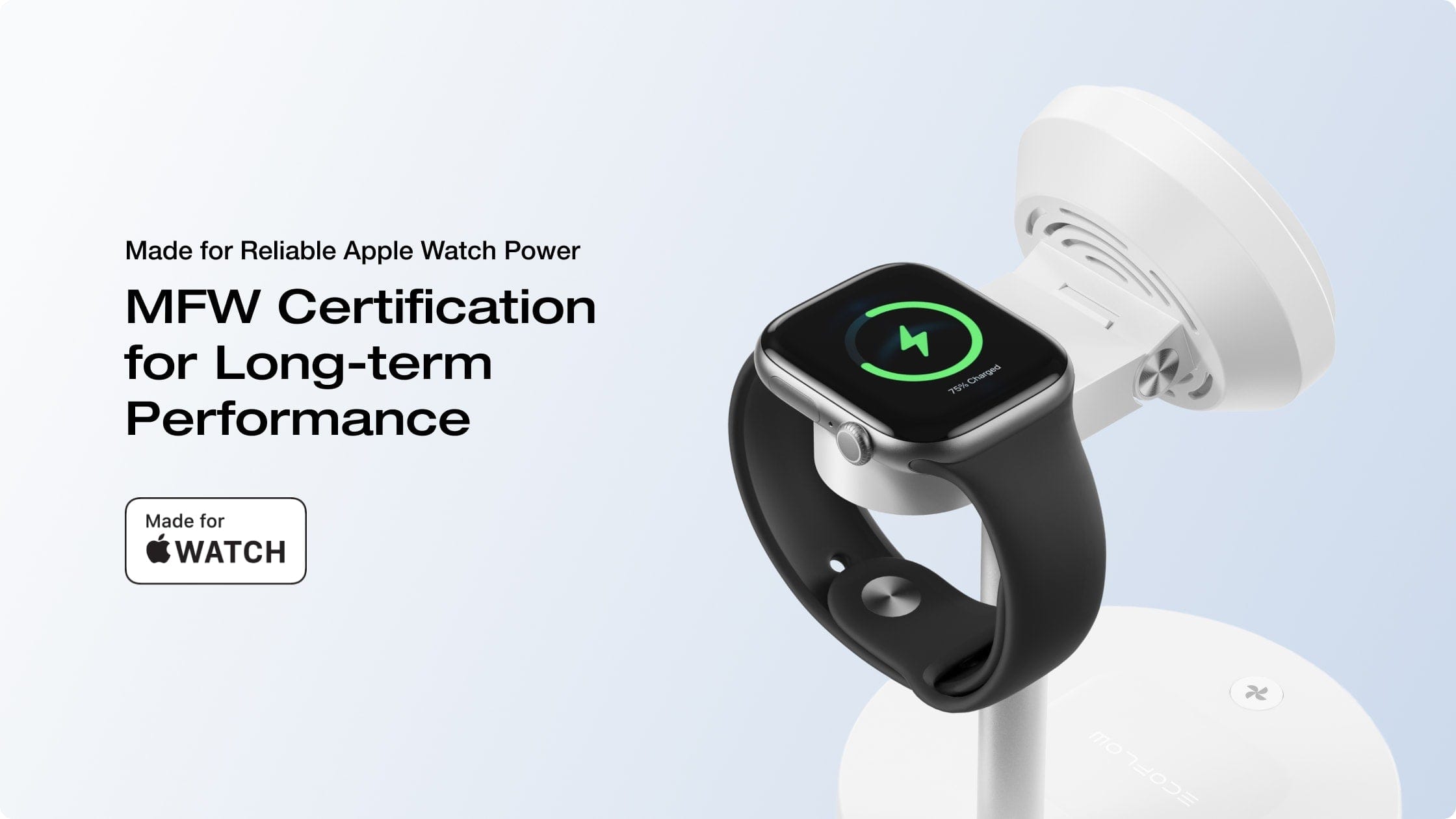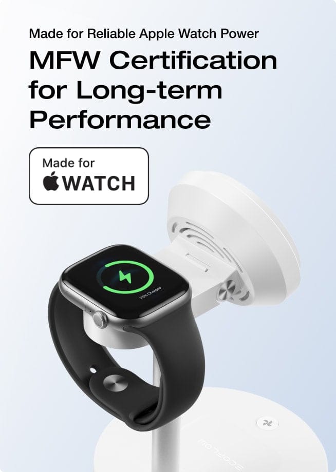 While you unwind, MFW Certification for flawless Apple Watch compatibility—no charging failures after updates, reliable power every time. It prevents overheating and overcharging, protecting your watch’s battery for long-term performance. 5W wireless fast charging powers your Apple Watch 10 to 50% in just 21 minutes.