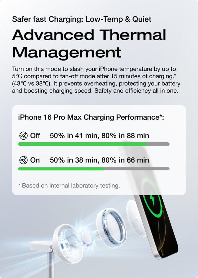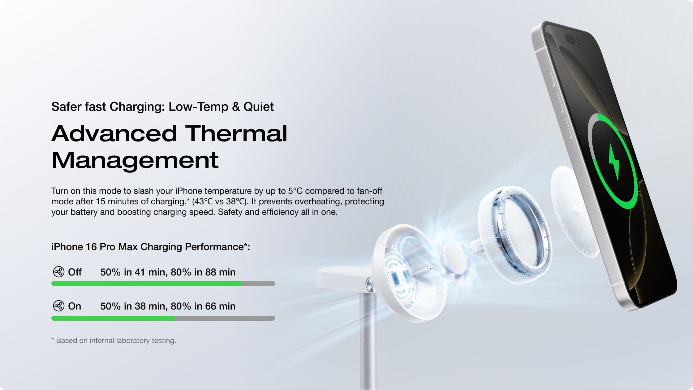 Take control with our Advanced Thermal Management. Whisper-quiet at under 29dB,* it delivers cooler, safer overnight charging, letting you sleep peacefully.