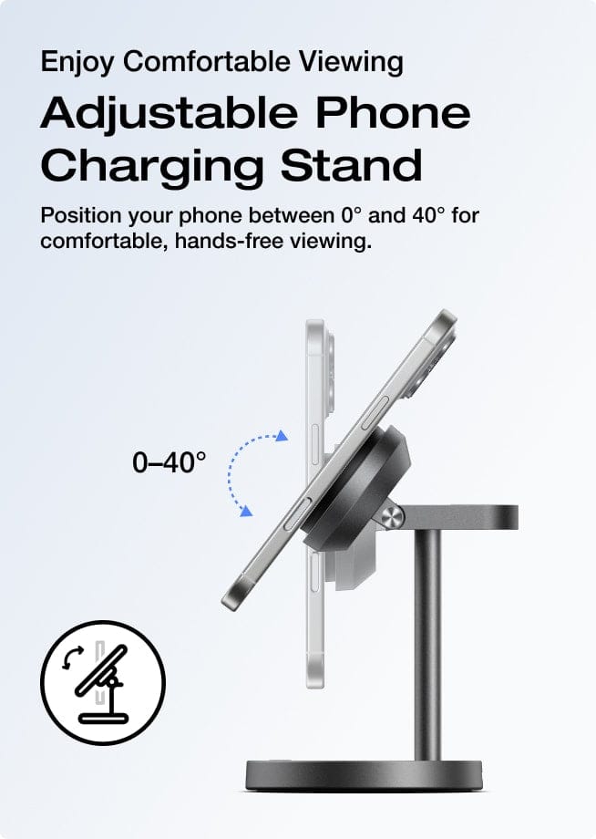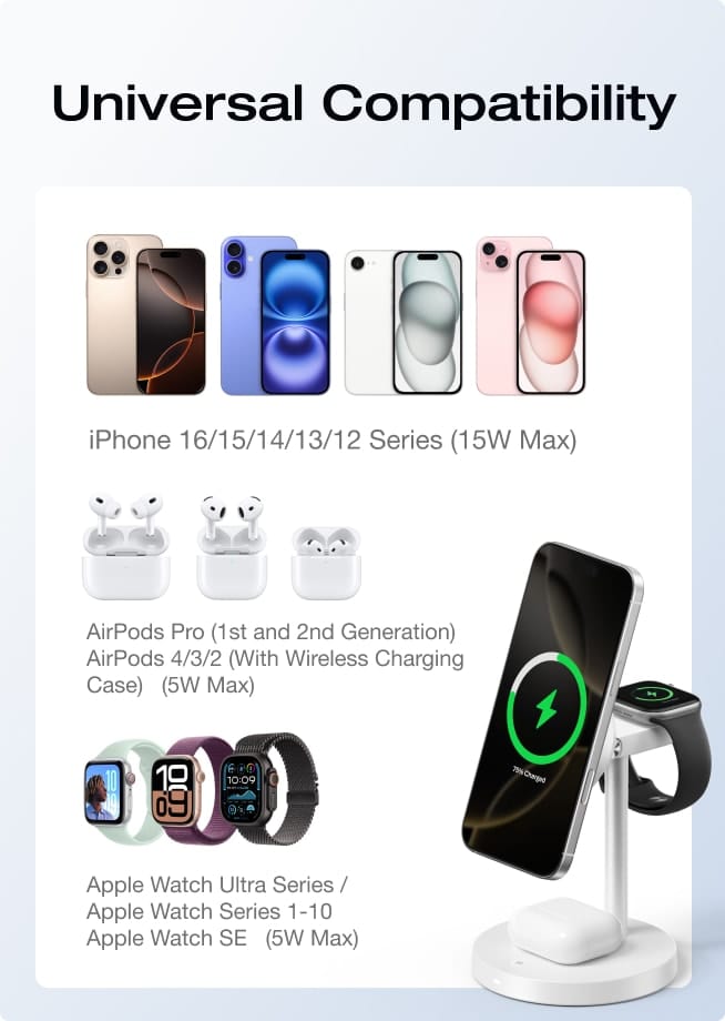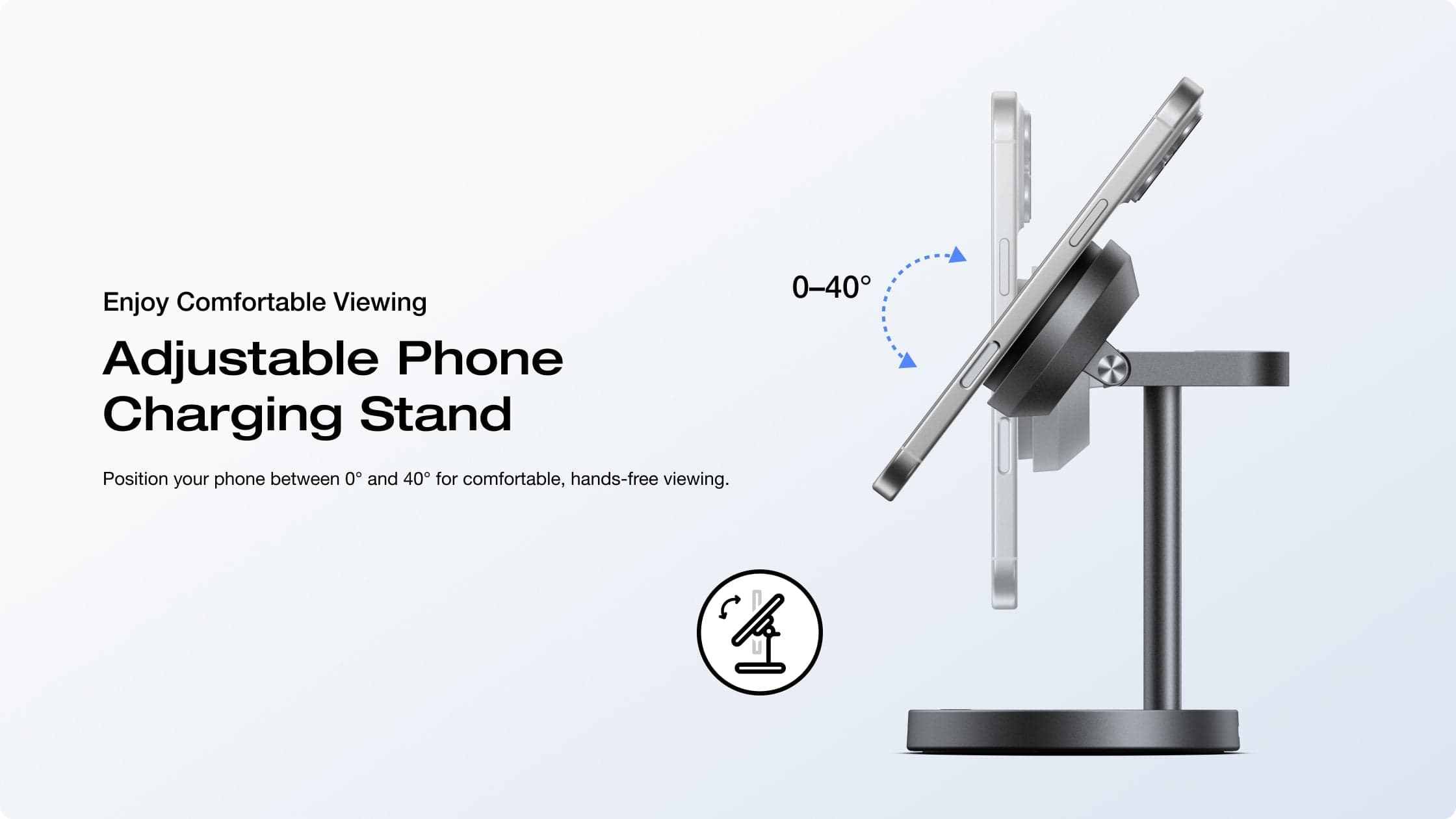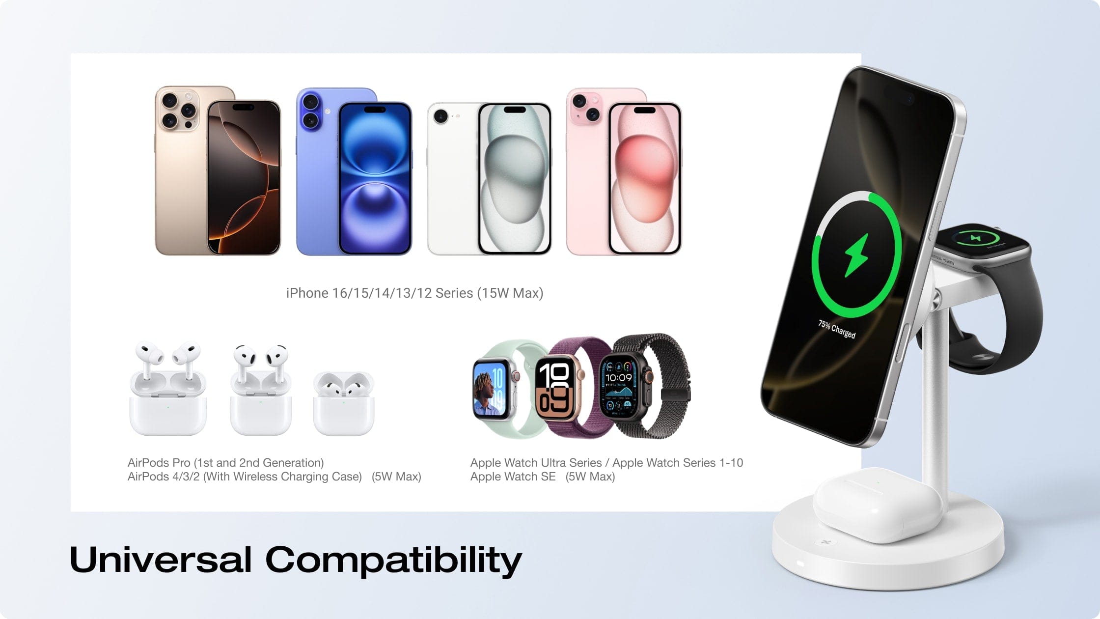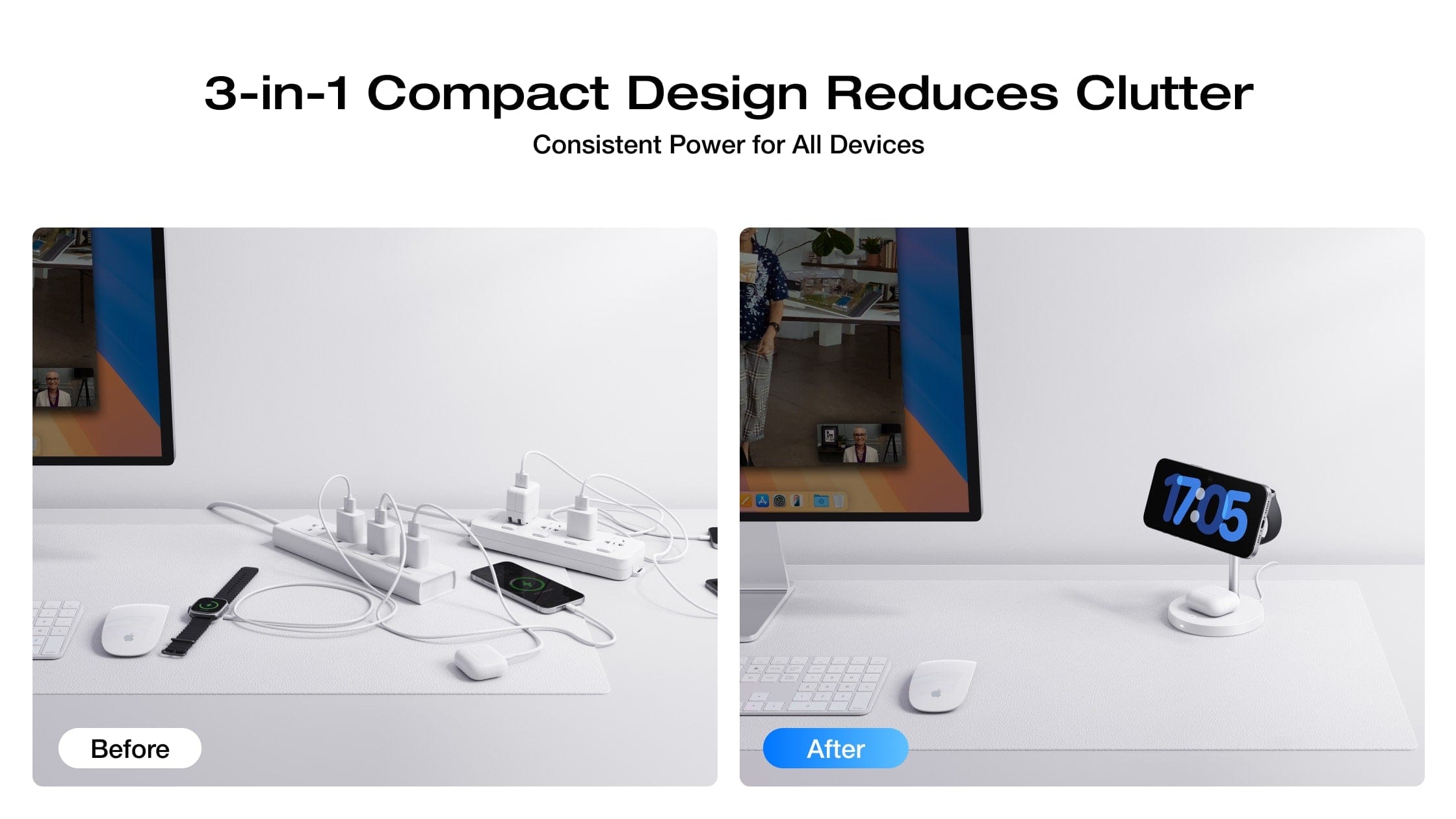 Avoid cable chaos with our space-saving charging stand—the key to a streamlined and organized desk. Delivers steady power to all three devices charging simultaneously, ensuring each one gets the boost it needs.