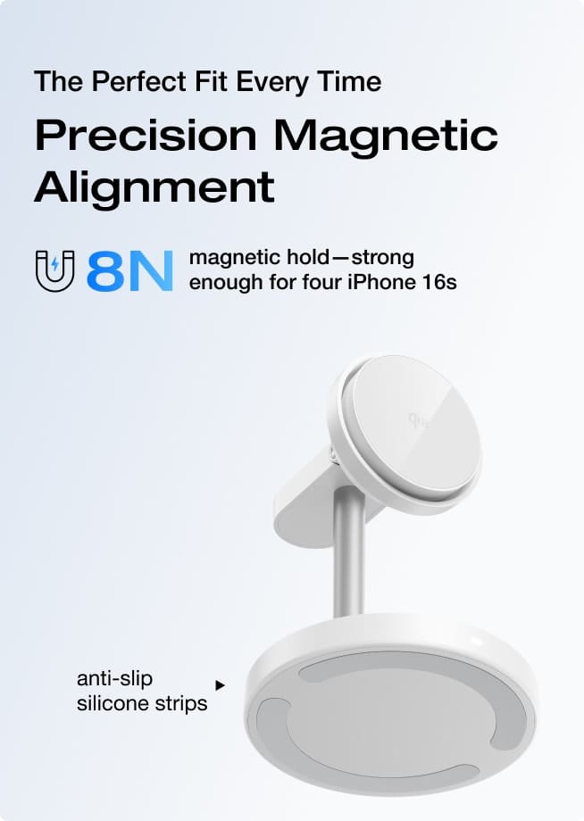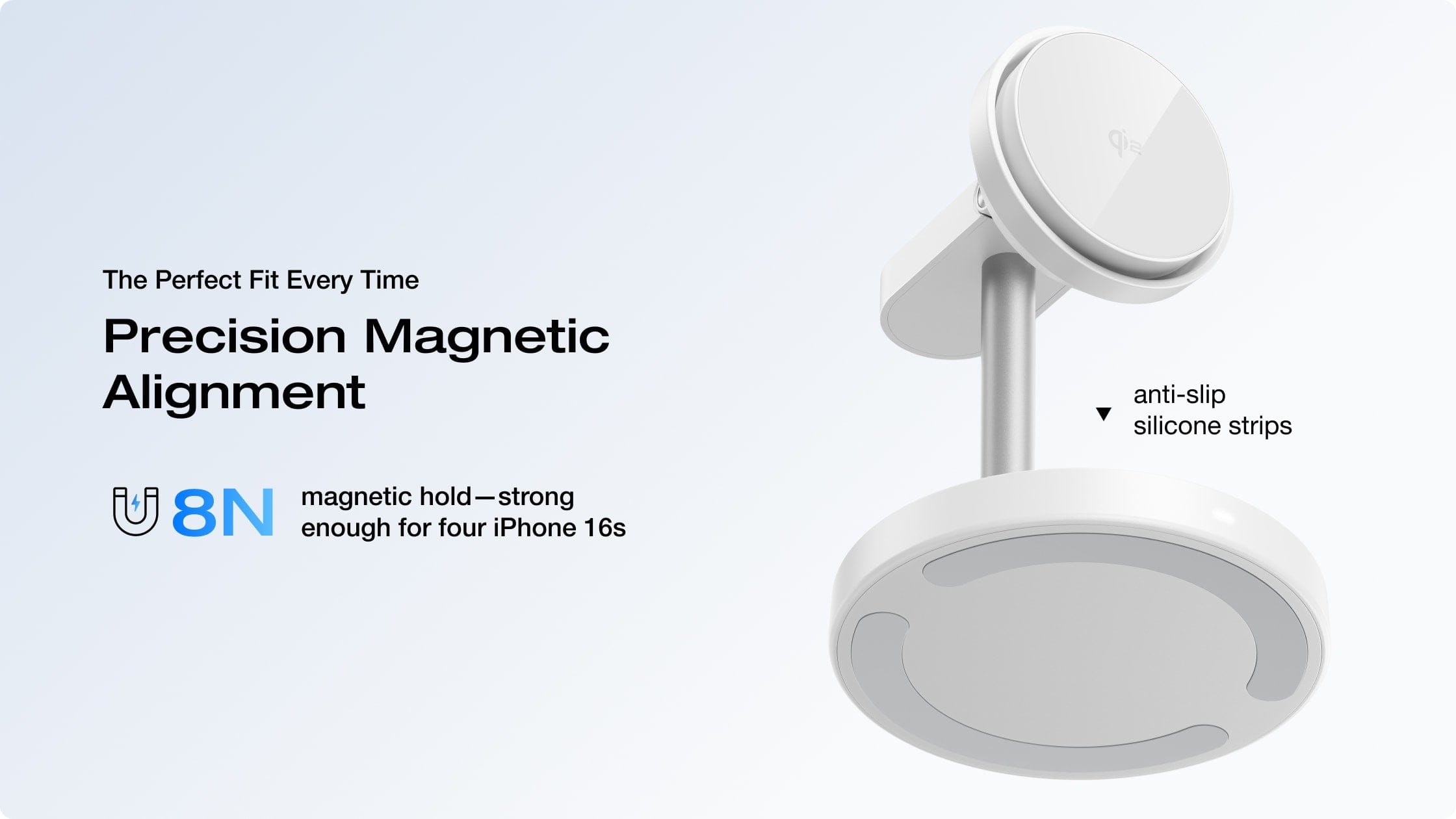 Magnetic auto-alignment ensures reliable contact every time—just snap and charge. The weighted base and anti-slip silicone strips keep everything stable, preventing accidental tipping while you power up.